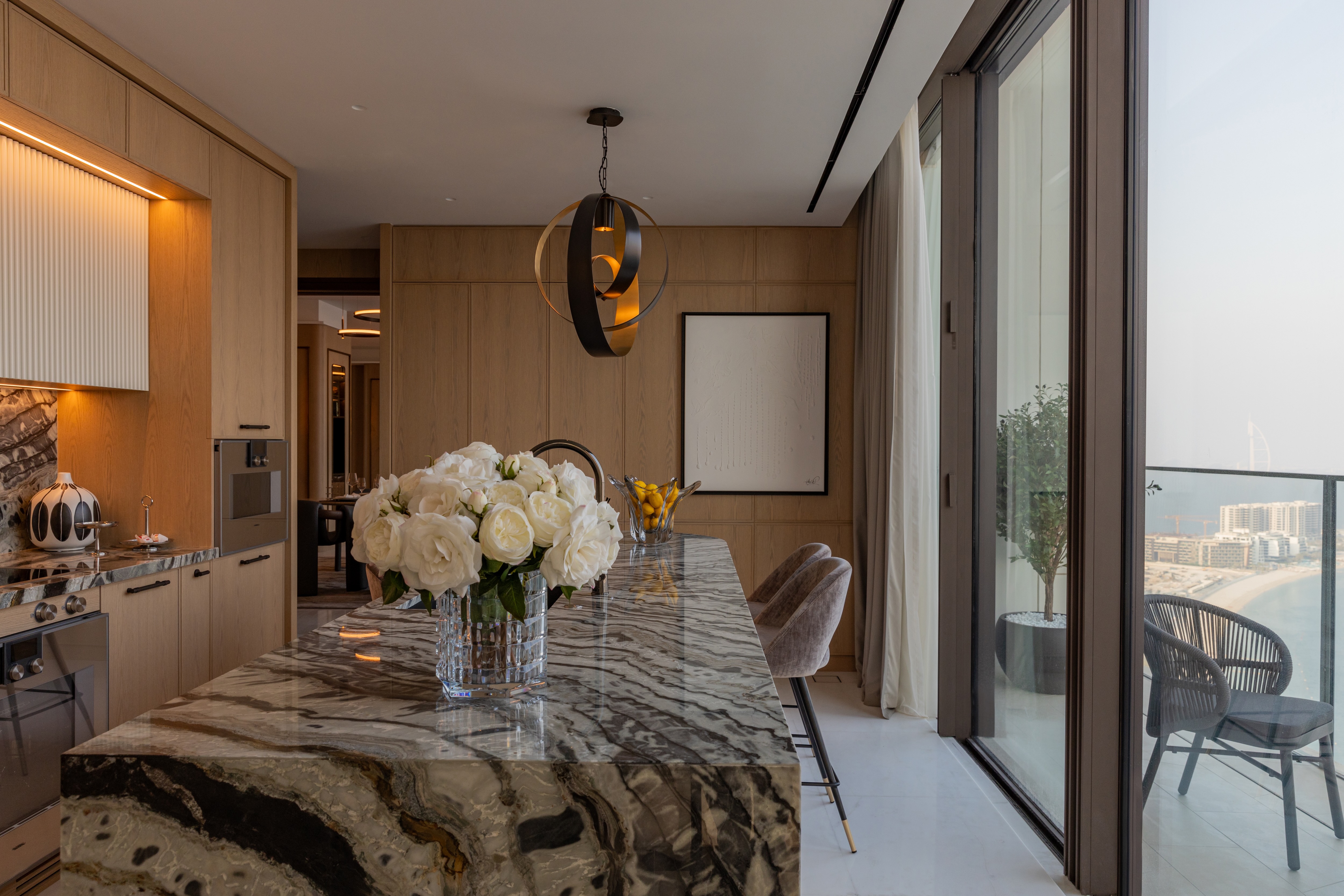 The residence boasts a grand open-plan living and dining area, framed by floor-to-ceiling windows that flood the space with natural light and offer breathtaking views of the Arabian Gulf and Dubai skyline. The state-of-the-art kitchen is fully equipped with top-tier appliances, ideal for both everyday living and entertaining.
